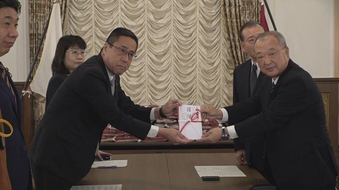 5日は県庁で贈呈式が行われ、協議会の桑原孝正会長から石寺副知事に目録が手渡されました。