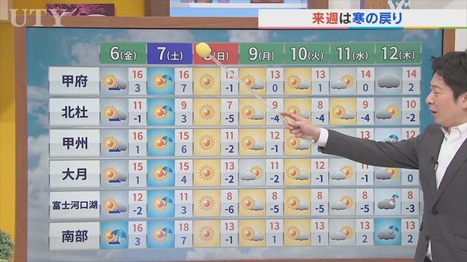 6日は天気下り坂 夜から雨のところも 来週は寒の戻りに 米津龍一気象予報士が解説 山梨 2026年3月5日(木) 20:52 国内 天気 米津龍一気象予報士:あすのお天気ポイントはこちらです。天気下り坂で夜は雨のところもある見通しです。