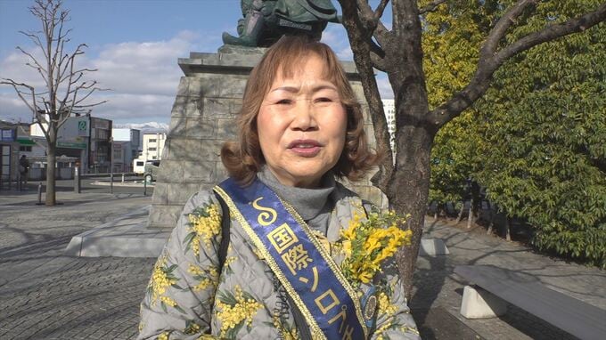 6日はおよそ30人が参加して「国際女性デー」を象徴するミモザの花を身に着け、横断幕を掲げながら活動への理解と協力を呼びかけました。