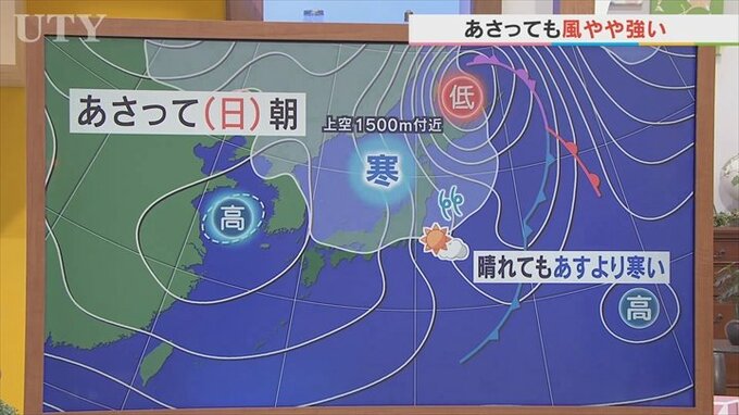 さらにこの北風に乗って上空の冷たい空気=寒気があすよりも強まりますので、晴れてもあすより寒くなります。