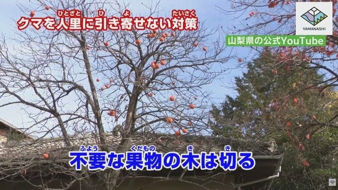 「あなたの近くにはクマはいます」クマの被害に遭わないための対策 動画で紹介 クマ目撃が過去最多の山梨県 2026年3月10日(火) 18:36 国内 また人里に引き寄せないため、エサとなる不要な果物の木は切ること、見通しをよくするため定期的に草刈りを行う、といった対策も紹介しています。 この動画は県の公式ユーチューブなどで確認することができます。