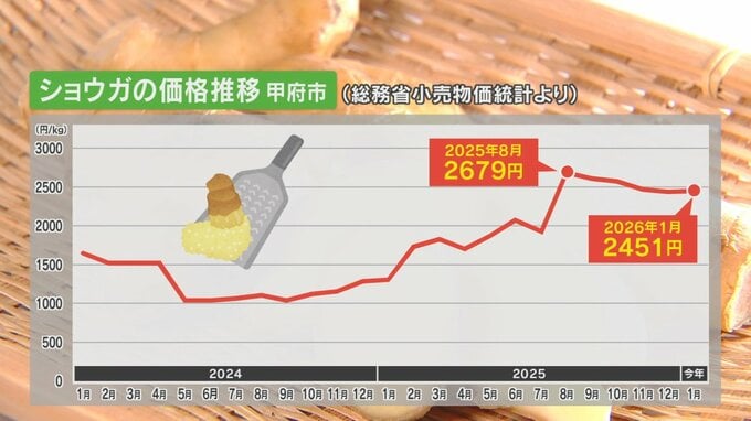 甲府市のショウガの価格は、1キロ1000円台で推移していましたが、去年8月に2600円台に高騰し、高止まりの状態が続いています。