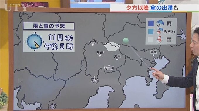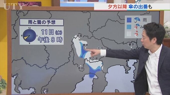 8時頃中・西部にも一部雪のところもありそうです。さらに富士五湖方面でこの後雪の範囲が広がってくる可能性があります。ですので降ったとしても1cm前後と見ていますが夕方以降ちょっと変わりやすい天気ですので、お帰りに備えて傘の準備は忘れずにお願いします。