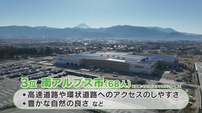 商業施設の多さや子育てのしやすさで人気 新築戸建てで「住みたいエリア」ランキング 県内市町村の順位は? 2026年3月12日(木) 20:11 国内 暮らし・マネー 気になるトップ3は? 3位は去年コストコがオープンした南アルプス市。 高速道路や環状道路へのアクセスのしやすさに加え、ユネスコエコパークにも登録されている豊かな自然の良さが人気の理由となっています。