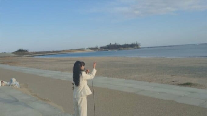 東日本大震災の発生から15年を迎えた11日、和田弘とマヒナスターズの元ボーカルとして活躍した山梨県大月市在住のシンガー・ソングライター、しらいみちよさんが宮城県気仙沼市の大谷(おおや)海岸を訪れました。