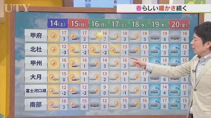 夜になると少し雲が広がる天気となります。来週以降も15℃以上の日が続く見通しとなっていますので、昼間は基本的にはジャケット1枚で過ごせる陽気となるんですが朝の最低気温を見ていくと5℃を下回る日もまだまだありますので、そうなるとダウンが手放せないことになりますからダウンはまだクリーニングに出しては駄目です。