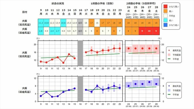 近畿地方の気温は、向こう5日間程度は平年並ですが、その後は暖かい空気が流れ込みやすくなるため高く、24日頃からはかなり高くなる可能性があります。