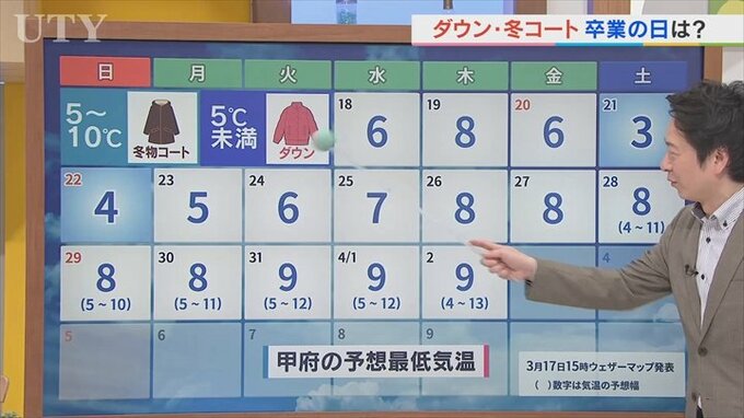 その先はどうなのか甲府で16日間先の予報見ていきますと、ようやく5℃を下回らない日が見えてきました。それが23日から24日。つまり次の週末でもうダウンは卒業ができます。