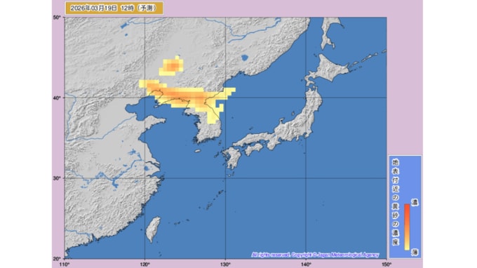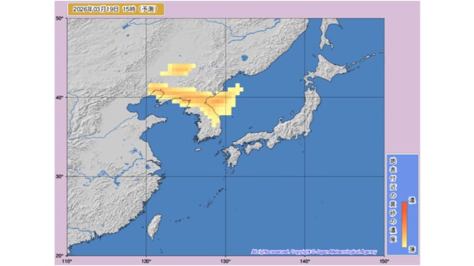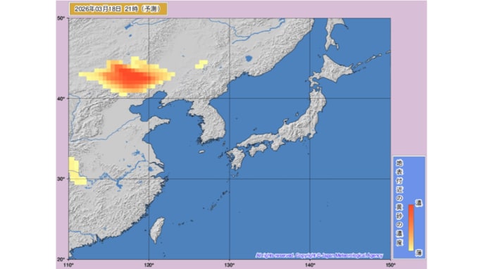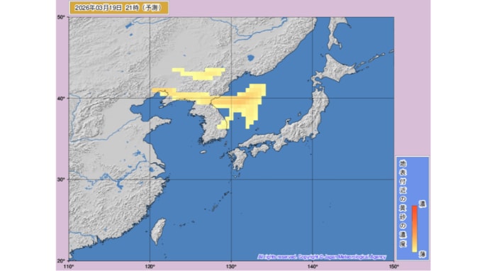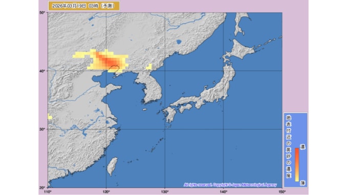 【黄砂情報】春分の日の20日に黄砂飛来か 気象庁の「黄砂情報」シミュレーション 2026年3月18日(水) 17:10 国内 天気 黄砂はいつ・どこに? 気象庁の黄砂シミュレーション 18日のシミュレーション 19日のシミュレーション