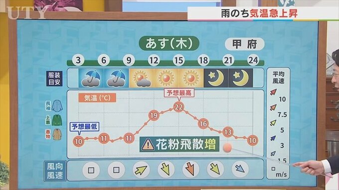 雨の後晴れてきて、特に昼前から夕方にかけては風が強い状況が続きます。風速が大体8m前後となりそうです。ですから雨上がりで晴れて気温が上がって風が強いと注意しなければいけないのは花粉です。