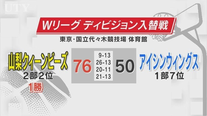 山梨クィーンビーズは1部 7位のアイシンと対戦し、第2クオーターで逆転に成功するとそのままリードを広げ76対50で初戦を勝ちました。