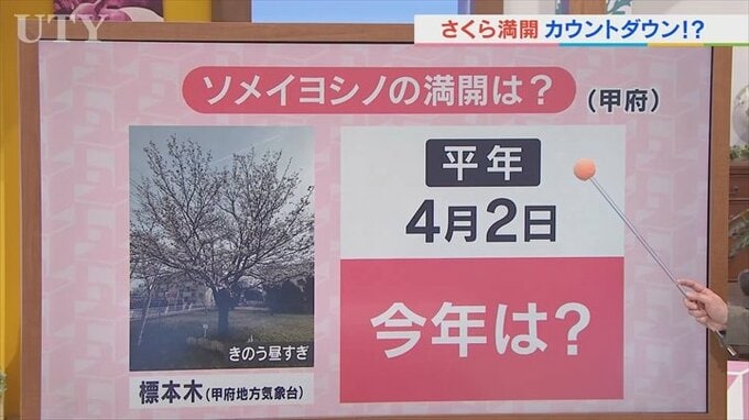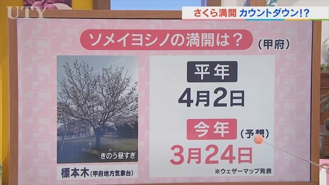 平年の満開は4月2日ですが今年はあす3月24日と予想しています。だいぶ早いです。これまで過去一番早かったのが2002年の3月22日、その次に早いのが2023年の3月24日。つまりあすは2番目に早い開花となるかもしれません。
