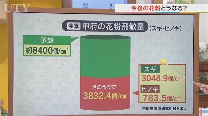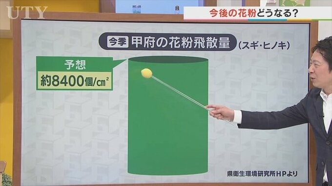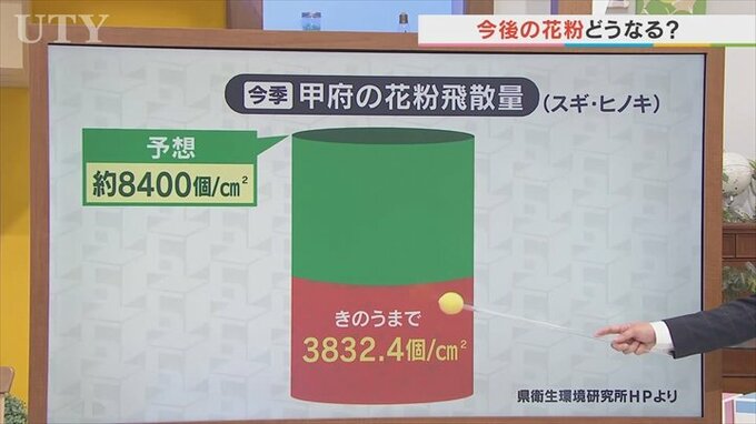 県の衛生環境研究所によりますと、今年はスギとヒノキを合計して8400個の花粉が予想されているんですが、