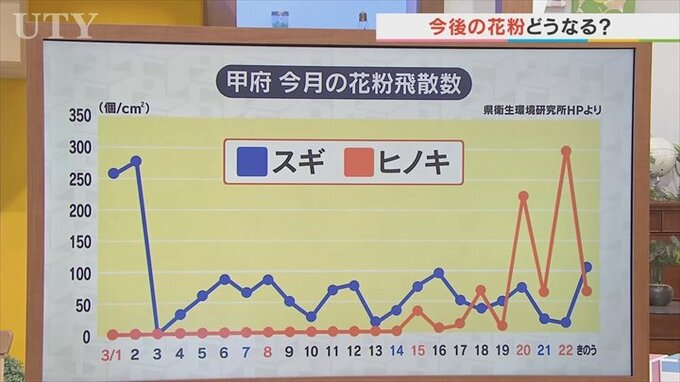 オレンジ色はヒノキですが、ヒノキは全然飛んでいなかったんですがここ1週間でもう突き抜けて飛んでいる形です。スギのピークはおそらく過ぎていると。大体例年3月の上旬です。きのうは多く飛んでいますがこれからはヒノキの花粉が多くなる傾向となりますので花粉症の方はしっかりと対策をお願いします。