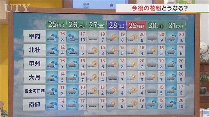 天気だけ見ていくと、雨の日も結構多いので、あまり雨の日は花粉が飛ばないんですが気温が高めの日が多いんです。ですのでヒノキの花粉症をお持ちの方は特にしんどいかもしれませんが頑張って対策をお願いします。