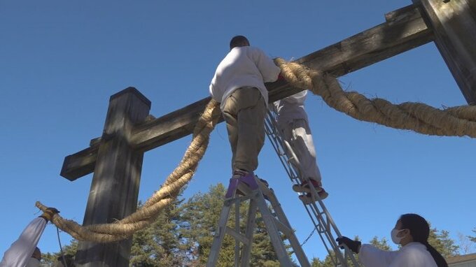 大きいものは長さ5m、重さ30kg しめ縄の架け替え作業 北杜市の身曾岐神社 2022年12月28日(水) 12:37 国内 山梨県北杜市の身曾岐神社でしめ縄の架け替え作業が行われました。 身曾岐神社のしめ縄は地元の農家から奉納されたワラで作られています。最も大きいものは長さ5m、重さ30kgで、本殿前のしめ柱に27日、神職らが…