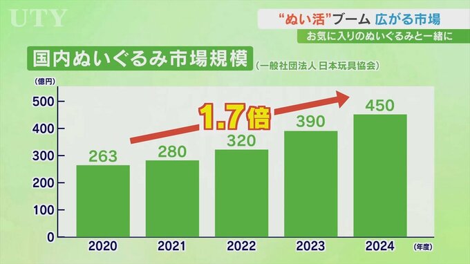 こちらはぬいぐるみの市場規模の推移です。昨年度は過去最高のおよそ450億円で5年前の1.7倍に増加しました。