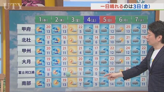4月1日は午前中は晴れ間があるものの午後からは雨 4月から6月までの予報も含め 米津龍一気象予報士が解説 山梨 2026年3月31日(火) 20:23 国内 天気 米津龍一気象予報士:あすのお天気ポイントはこちらです。天気下り坂で再び傘の出番。ちょっと桜にとっては試練の雨となりそうです。