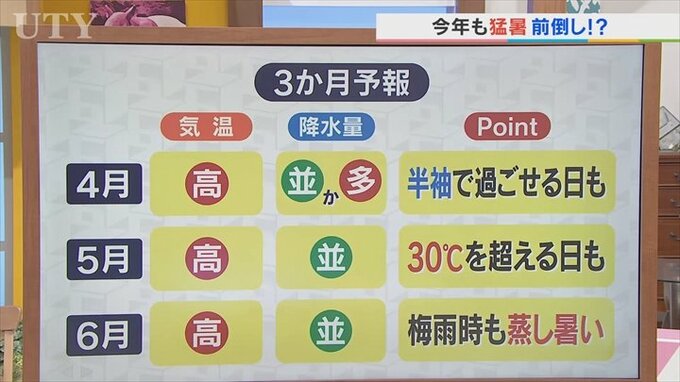 ずっと気温が高い予想となっています。ですから4月は半袖、そして5月は30℃超え。さらに6月も梅雨でも蒸し暑い形となりますので、暑さ厳しくなりそうです。