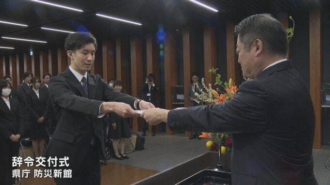 「誠心誠意、職務の遂行に専念することを誓います」過去最多204人を採用 山梨県庁で辞令交付式 2026年4月1日(水) 12:18 国内 県庁では過去最多となる204人の新規採用職員が辞令交付式に臨みました。 式では一人一人の名前が読み上げられ、代表者に辞令が手渡されました。 そして長崎知事が「失敗を恐れずに仲間と力を合わせてベストを尽くしてください」とエールを送りました。