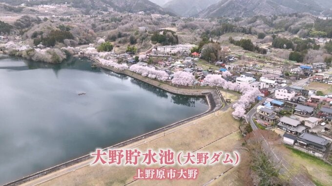 遊歩道沿いに植えられた千本の桜が見頃を迎え水辺に映える 山梨・大野貯水池