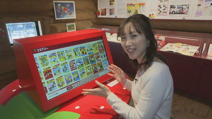「こちらはサンリオが創刊した いちご新聞が全て見られるんです。中をタッチすると、いちごの王さまからのメッセージもありますよ」