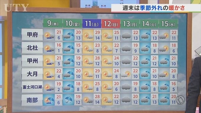 9日は天気ゆっくり下り坂でも気温差に注意 花粉の飛散状況も含めて 米津龍一気象予報士が解説 山梨 2026年4月8日(水) 20:15 国内 天気 週間天気を見ていきます。 特に気温が上がりそうなのがこの週末です。 甲府29℃予想。まだまだヒノキ花粉油断できませんので、お気をつけください。 <県内各地点あすの天気は動画をご覧ください>