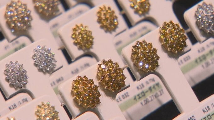 出展の総額はなんと1200億円!中国に代わり東南アジア各国で需要 ジュエリー展示会 山梨・甲府 2026年4月8日(水) 20:11 国内 甲府市のアイメッセ山梨を会場に8日に開幕した山梨県内最大規模のジュエリー展=山梨ジュエリーフェアです。 バイヤーなどプロ向けの展示会で、今年は県の内外から120社が出展し持ち込まれたジュエリーは総額1200億円に上ります。