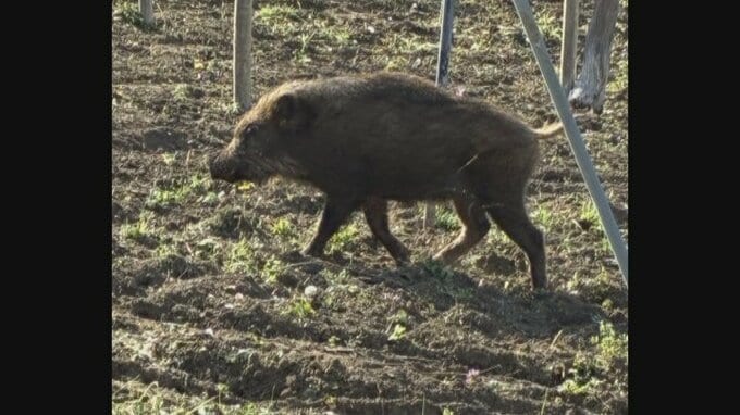 9日朝、住宅が点在する山梨県甲州市の国道近くの畑にイノシシが出没しました。