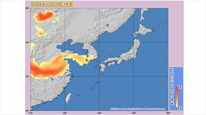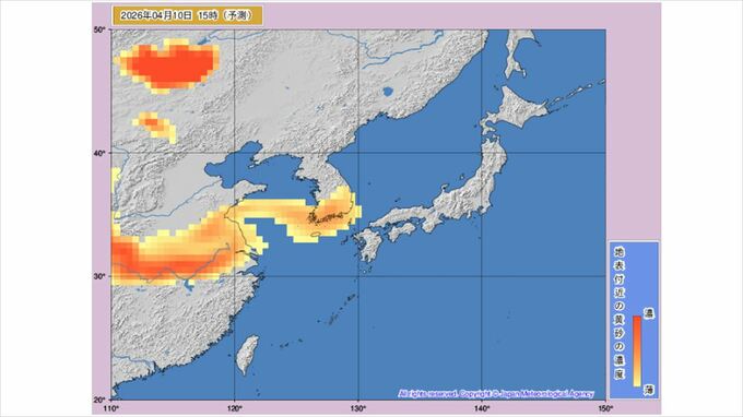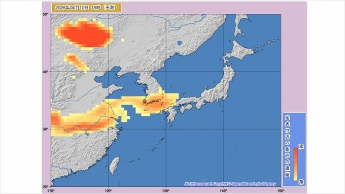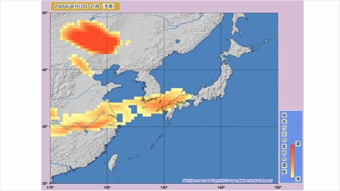 【黄砂情報】きょうから黄砂飛来か あす11日には九州から関東など広い範囲に 気象庁の「黄砂情報」シミュレーション 2026年4月10日(金) 11:42 国内 天気 黄砂はいつ・どこに? 気象庁の黄砂解析予測図 気象庁の黄砂解析予測図は当日から1日先まで3時間ごと、2日先から3日先まで6時間ごとの予測になっています。 10日(金)のシミュレーション