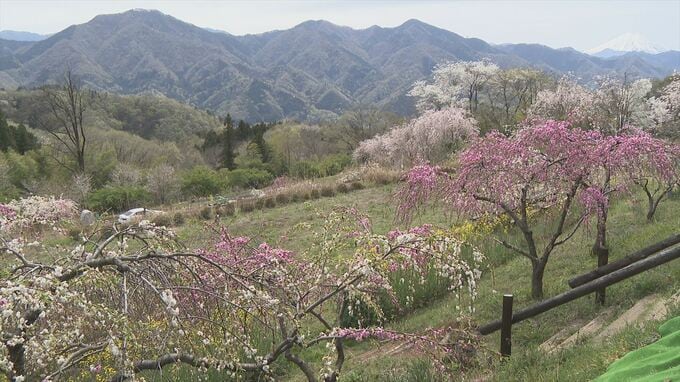 ピンクに色づくシダレザクラがシンボルの、農業公園「大月エコの里」。