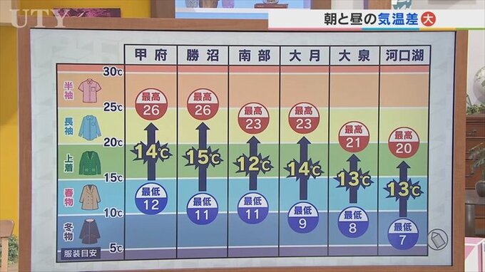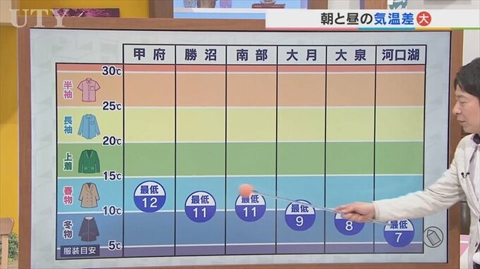 気温差も勝沼で15℃。5度につき着るもの1枚分違いますから気温差が大きくなる見通しです。