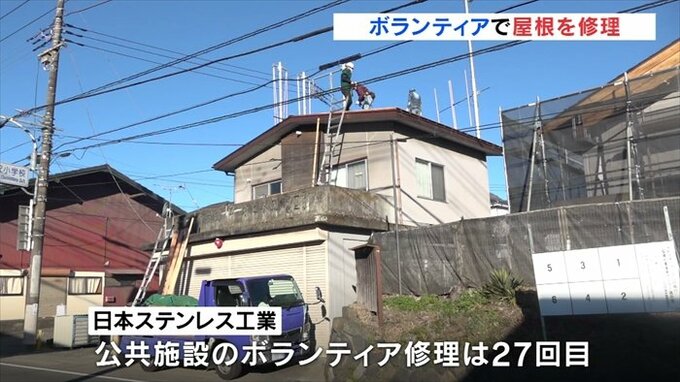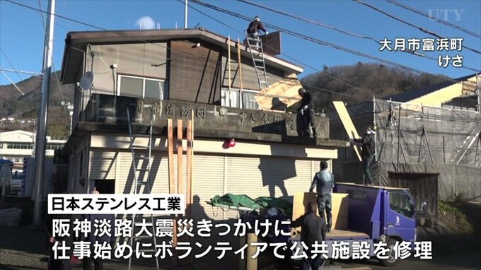 大月市にある日本ステンレス工業は阪神淡路大震災で屋根などを修理する職人を派遣したことをきっかけに毎年、仕事始めにボランティアで傷んだ公共施設の屋根のふき替えを行っています。