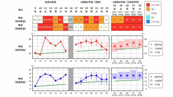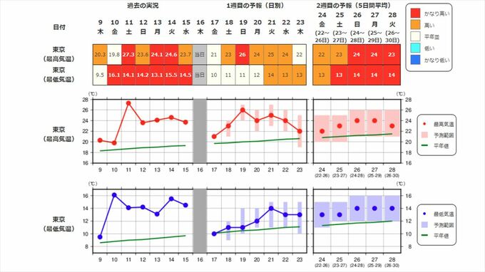 関東甲信地方の向こう2週間の気温は、暖かい空気に覆われやすいため高く、24日頃からはかなり高くなる見込みです。
