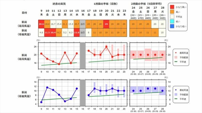 北陸地方の向こう2週間の気温は、暖かい空気に覆われやすいため高く、22日頃からはかなり高くなる見込みです。