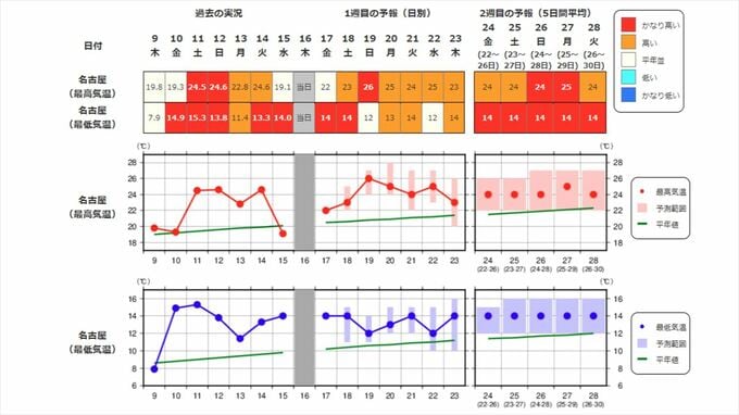 東海地方の向こう2週間の気温は、暖かい空気に覆われやすいため高く、21日頃からはかなり高くなる見込みです。