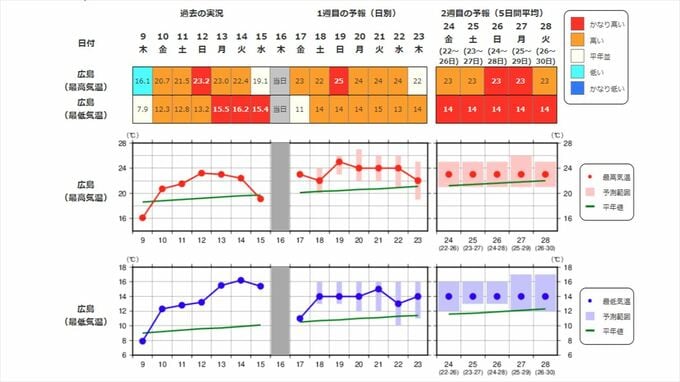 中国地方の向こう2週間の気温は、暖かい空気に覆われやすいため高く、かなり高い日が多い見込みです。