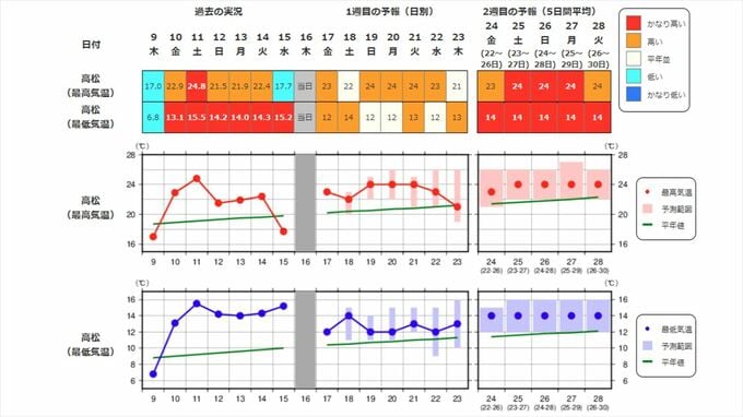 四国地方の向こう2週間の気温は、暖かい空気に覆われやすいため高く、22日頃からはかなり高くなる見込みです。