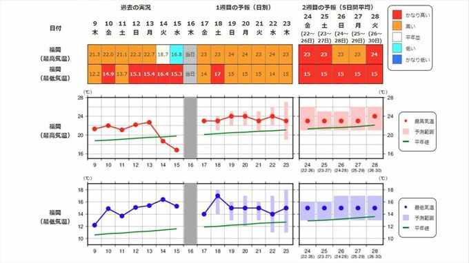 九州北部地方(山口県を含む)の向こう2週間の気温は、暖かい空気に覆われやすいため高く、かなり高い日が多い見込みです。