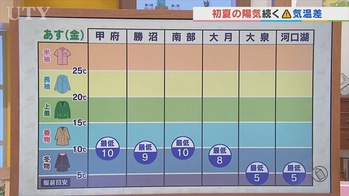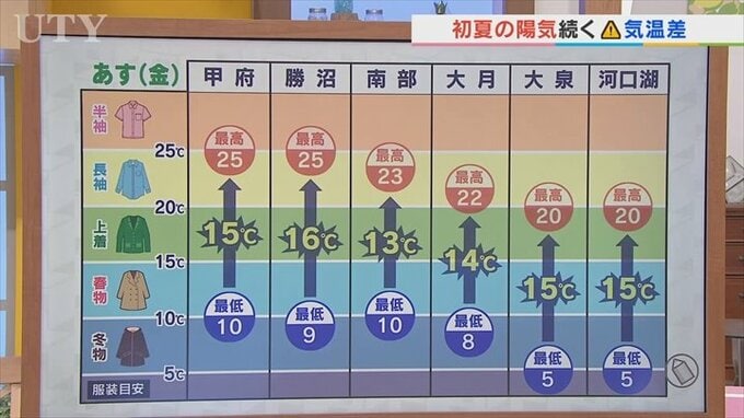 そこから日差しの力で気温が上がりまして、甲府、勝沼は2日連続の25℃以上の夏日となりますので、昼間は半袖で過ごせますからもう何着たらいいんだという感じです。皆さん、脱ぎ着しやすい服装で寒暖差に対応お願いします。