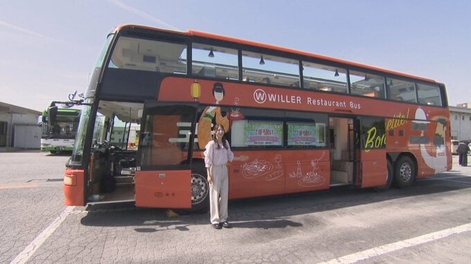 「オレンジ色のかわいらしいラッピングが施されたこちらのレストランバス。中には厨房も備えられているんです。きょうは特別に乗ってみます」