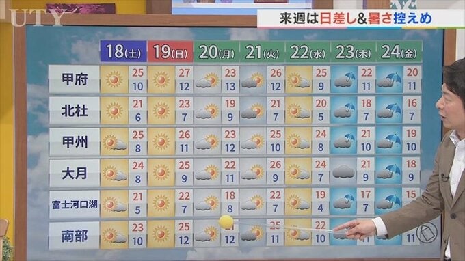 18日は汗ばむ陽気で気温差に注意 19日は6月上旬並みの気温に 米津龍一気象予報士が解説 山梨 2026年4月17日(金) 21:48 国内 天気 米津龍一気象予報士:あすのお天気ポイントはこちらです。汗ばむ陽気。気温差も大きくなりそうです。