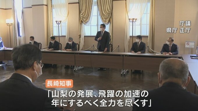 4日は各部局長などを集めた2023年の初めての庁議が行われ、長崎知事は年頭のあいさつで今年を「山梨の発展・飛躍の加速の年にするべく全力を尽くす」と述べました。