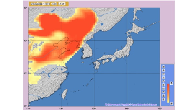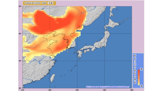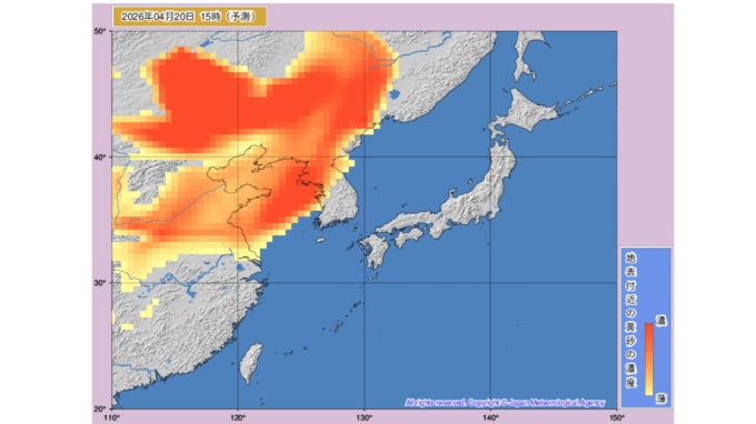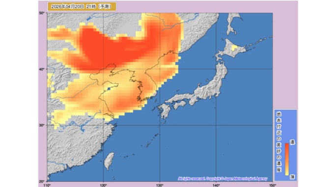 【黄砂情報】21日から北日本から西日本の広い範囲で予想 濃度が濃い赤い部分も本州に 気象庁の「黄砂情報」シミュレーション 2026年4月20日(月) 11:19 国内 天気 黄砂はいつ・どこに? 気象庁の黄砂解析予測図 気象庁の黄砂解析予測図は当日から1日先まで3時間ごと、2日先から3日先まで6時間ごとの予測になっています。 20日(月)のシミュレーション