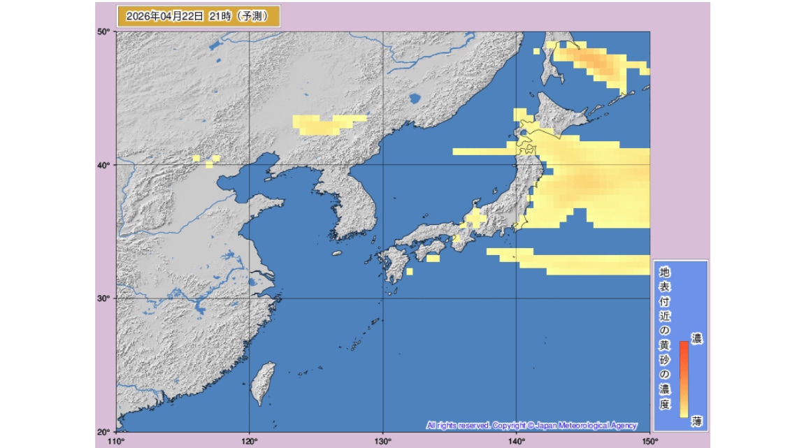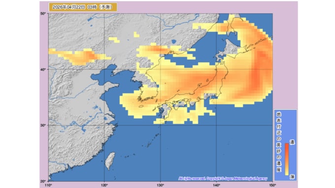【黄砂情報】21日から北日本から西日本の広い範囲で予想 濃度が濃い赤い部分も本州に 気象庁の「黄砂情報」シミュレーション 2026年4月20日(月) 11:19 国内 天気 22日(水)のシミュレーション