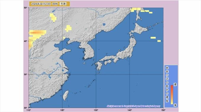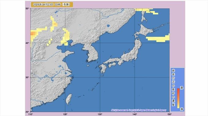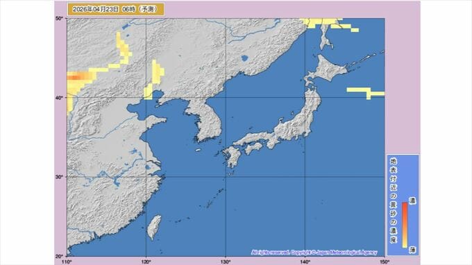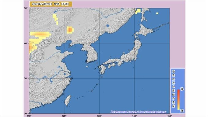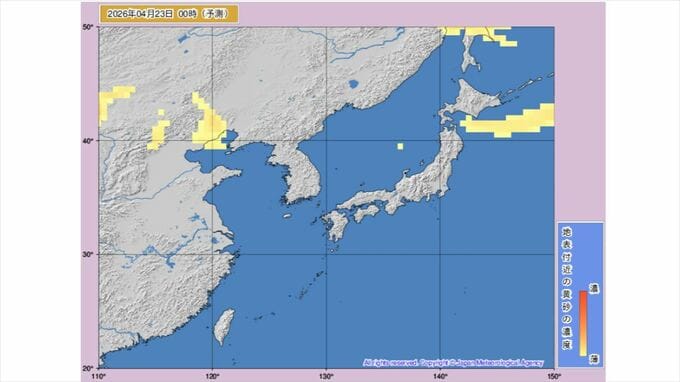【黄砂情報】 22日12時でも黄砂が残る予想 関東や東海、東北、北海道などの広い範囲に 気象庁の「黄砂情報」シミュレーション 2026年4月22日(水) 10:58 国内 天気 23日(木)のシミュレーション