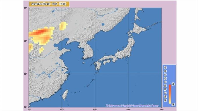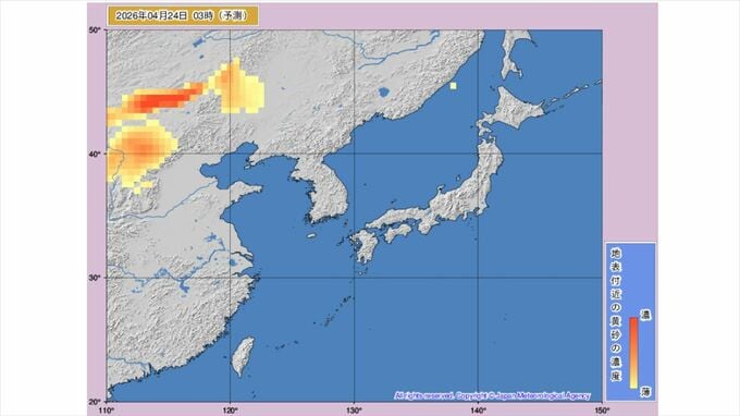 【黄砂情報】 22日12時でも黄砂が残る予想 関東や東海、東北、北海道などの広い範囲に 気象庁の「黄砂情報」シミュレーション 2026年4月22日(水) 10:58 国内 天気 24日(金)のシミュレーション
