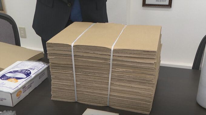 「ダンボールもですね、ここの紙と段を貼り合わせる接着剤を使っています。この接着剤自体がナフサ由来のものになります」
