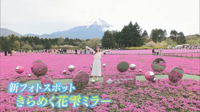 富士山と一面に広がるピンクのじゅうたん 50万株の芝桜が満開 富士芝桜まつり 山梨 2026年4月24日(金) 20:11 国内 ピンクの海に浮かんでいるかのような小舟や、ハートのモニュメントの他、今年は新たに「きらめく花雫ミラー」がフォトスポットに加わりました 富士芝桜まつりは5月24日まで開催されています。