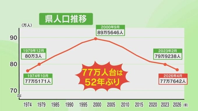 県の人口が77万人台となったのは52年ぶりです。